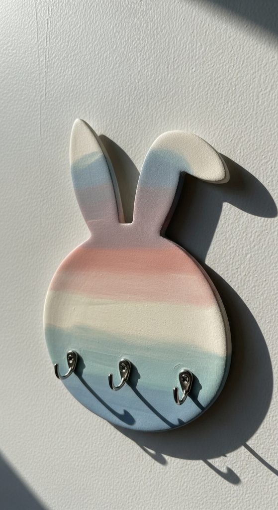 A bunny shaped key holder combines creativity with functionality. It can be mounted on a wall near the entrance to hold keys.