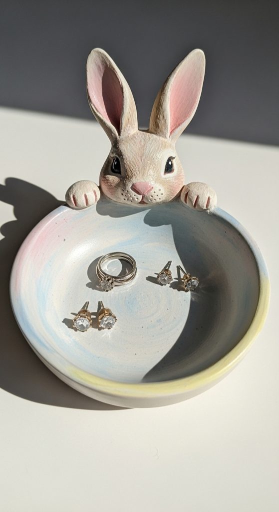 A bunny jewelry dish is a useful craft that can hold rings, earrings, and small accessories.