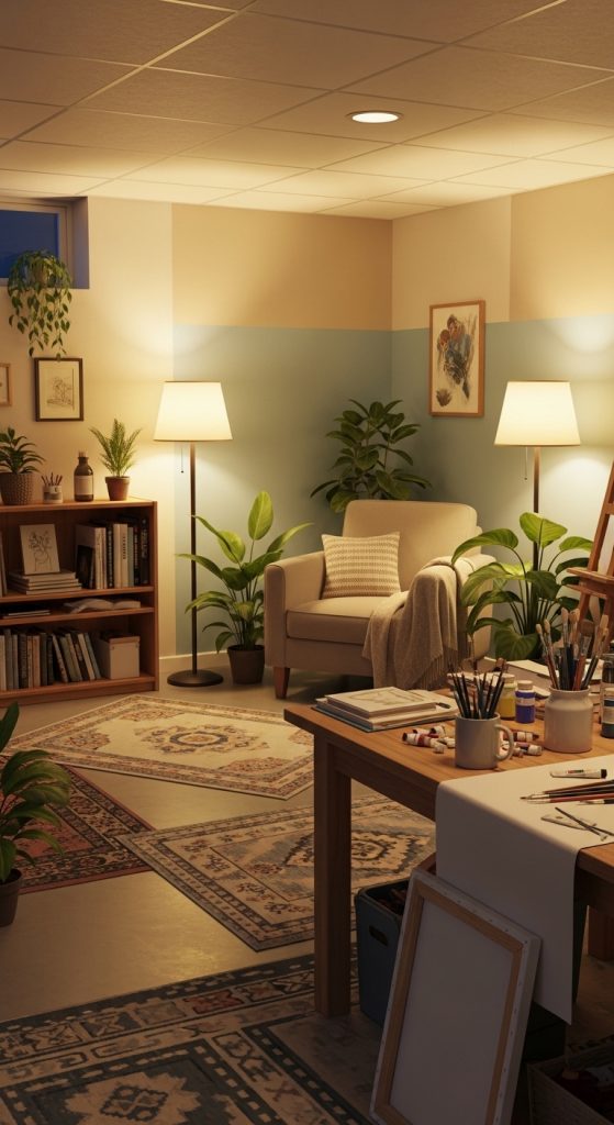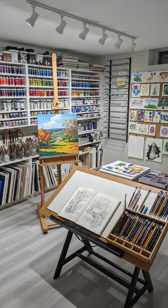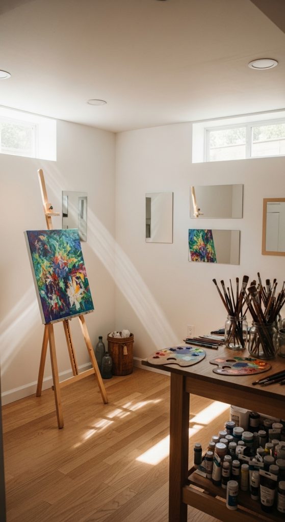 A basement can be turned into a dedicated painting and drawing studio with proper layout planning. The key is to organize the space so that painting tools, canvases, and supplies are easy to access.