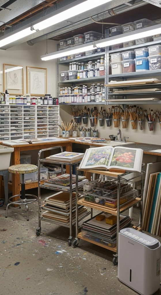 Many artists struggle with organizing art materials. A basement studio can solve this problem by focusing on smart storage solutions.