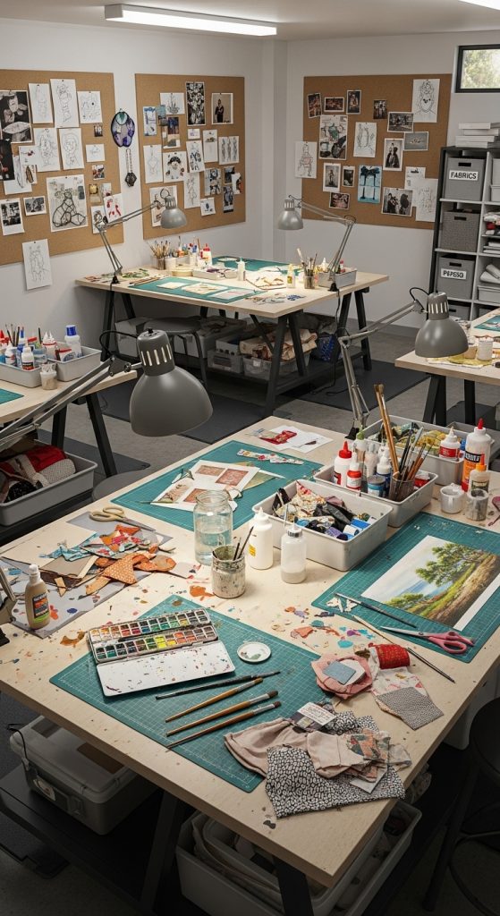 The supply storage zone should include shelves, cabinets, or rolling carts for paints, brushes, pencils, sketchbooks, and palettes. Using labeled containers will help keep everything organized.