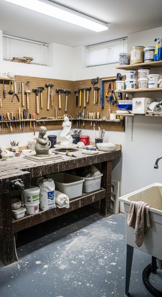 Important materials include a workbench, pegboards, tool hooks, sealed flooring, dust collection systems, and protective gloves. A workshop-style studio allows artists to handle heavy materials while keeping the basement organized and safe.