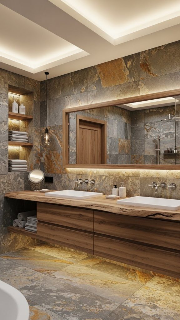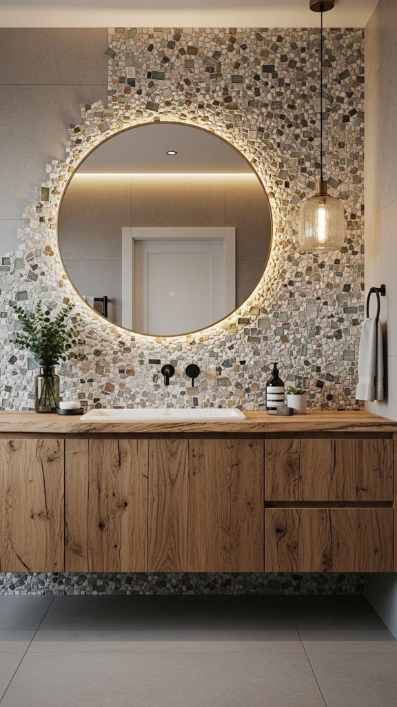 A stone backsplash adds character and depth to the bathroom. Each piece has natural variations, which creates a rich and authentic look. This option is ideal for those who appreciate natural materials and a more relaxed design style.