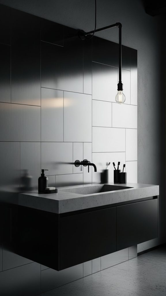 This backsplash idea works well in contemporary bathrooms. It pairs nicely with sleek fixtures and neutral colors. Metal tiles add a unique and modern touch without requiring complex maintenance.