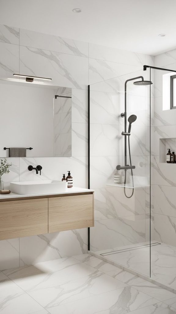 Before installing marble tiles, the wall must be strong, level, and properly waterproofed. Marble is heavier than ceramic tiles, so proper adhesive is essential. Thin set mortar designed for natural stone is recommended. Careful planning of tile placement helps highlight the natural veining and creates a balanced look.