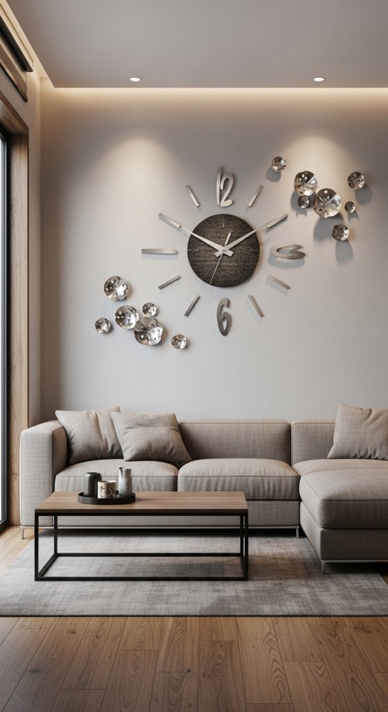 Large wall clocks or sculptural pieces are functional yet decorative solutions for a blank wall. A clock serves both practical purposes and adds a stylish element, while wall sculptures provide a three-dimensional artistic touch. Preparation involves selecting a design that complements the room’s theme, measuring the wall for proper placement, and ensuring secure mounting hardware is available. Materials include the clock or sculpture, screws, anchors, and a level. Position the piece at eye level for maximum visual impact. Sculptural décor can be made of metal, wood, resin, or other materials and can range from abstract forms to representational art. These elements serve as conversation pieces while filling empty space effectively. Using a single bold piece or a series of smaller complementary items can create a balanced, dynamic display. Decorative clocks and sculptures combine form and function, transforming a bland wall into a stylish feature in your living room.