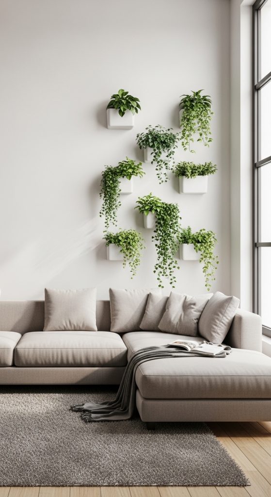 Bringing greenery into your living room is an excellent way to add life and freshness to a blank wall. Wall-mounted planters, vertical gardens, or hanging pots can create a striking natural display. Preparation starts with choosing suitable plants based on the light conditions in your living room. Materials include planters, wall anchors, brackets, and possibly a drip tray to catch excess water. When arranging plants, vary the heights and types to create a balanced and visually appealing display. Greenery adds texture, color, and a calming effect to the room. Consider trailing plants, succulents, or small ferns for low-maintenance options. Wall-mounted plants are particularly beneficial for small spaces where floor space is limited. Ensure that the plants receive adequate light and are watered appropriately to maintain their health. By incorporating greenery, you create a dynamic and refreshing focal point that elevates the overall ambiance of your living room.