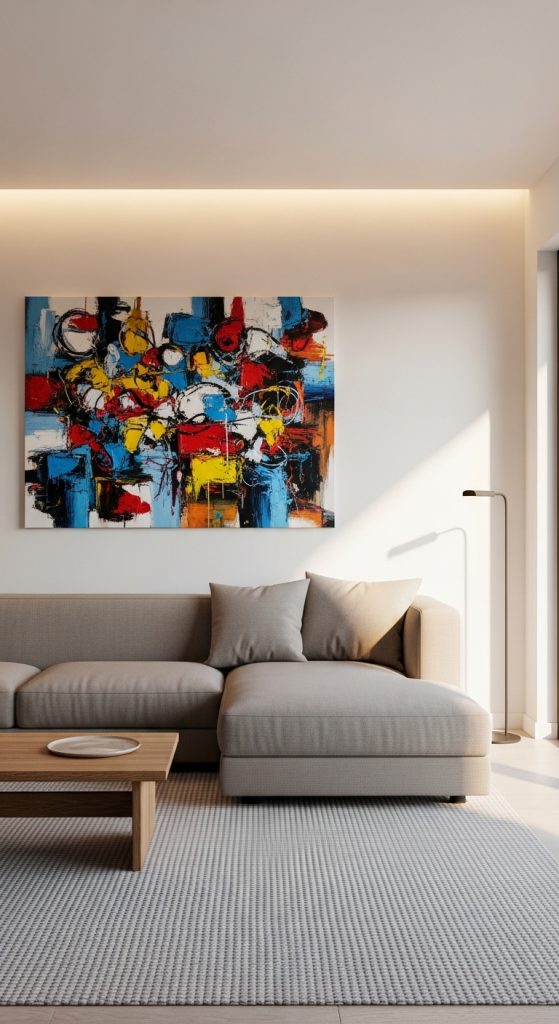 A single large art piece can dramatically change the feel of a blank wall. A statement painting or print draws the eye and can define the style of the entire living room. Preparation begins with selecting an art piece that complements your existing color scheme and furniture. Materials needed include the artwork itself, a strong hook or hanging system, and a level. When hanging large pieces, it is crucial to anchor them securely to the wall, especially if they are heavy. Consider the height and placement carefully, usually centering the piece above a sofa or console table. This approach reduces clutter and creates a bold visual focal point. Large statement art works well in minimalist and modern interiors where less is more. It can also be an expressive choice, reflecting your personality or passion for art. By investing in one high-quality piece, you can instantly elevate the aesthetics of your living room.