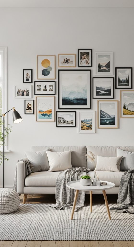 A gallery wall is one of the most popular ways to decorate a blank living room wall. It allows you to display your favorite photographs, artworks, and prints in a curated arrangement. To prepare for a gallery wall, start by selecting a theme. You can go for family photographs, travel memories, or a mix of abstract art. Materials needed include frames of various sizes, hooks, measuring tape, a level, and picture-hanging hardware. Before hanging, lay out your frames on the floor to experiment with the arrangement. This step ensures that the spacing and alignment look cohesive. You can use a mix of frame styles to create visual interest or stick to one style for a minimalist look. Start by hanging the largest piece at eye level and arrange smaller pieces around it. A gallery wall not only fills empty space but also personalizes your living room, making it feel warm and inviting.