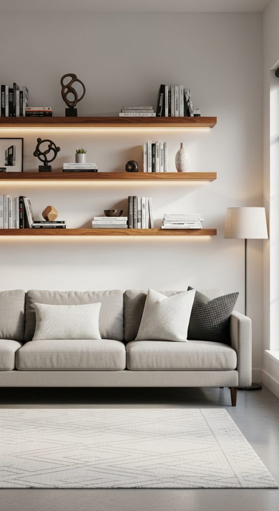 Floating shelves are an excellent way to combine functionality and aesthetics on a blank wall. These shelves appear to float without visible supports, giving the wall a modern and clean look. Before installing, measure the wall space to determine the number and placement of shelves. Materials required include floating shelves, wall anchors, screws, and a drill. Once installed, you can decorate the shelves with a mix of books, plants, sculptures, and vases. It is essential to balance the arrangement by mixing tall and short objects and adding pops of color through decorative items. Floating shelves work well for small or large walls and can be adjusted over time to accommodate new décor items. They also provide additional storage without cluttering the floor space. By layering objects and varying heights, you can create depth and visual interest while maintaining a practical function for your living room.