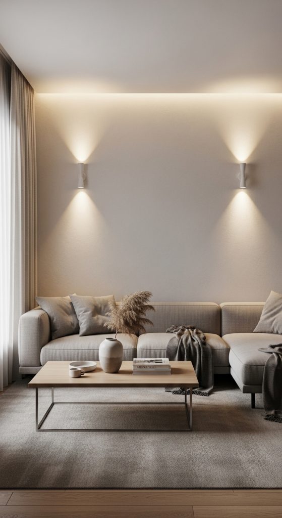 Decorative wall lighting is a practical and elegant solution for styling a blank wall. Sconces, LED strips, or accent lamps can add warmth and highlight specific areas or objects. Preparation involves determining the placement of fixtures, checking electrical wiring, and selecting the right style to match the room’s décor. Materials needed include the lighting fixtures, screws, anchors, and possibly electrical tools if hardwiring is required. Wall-mounted lights can serve as ambient, task, or accent lighting depending on the placement and design. They draw attention to art pieces, shelves, or architectural features, transforming a plain wall into a visually engaging element. Soft, warm lighting creates a cozy atmosphere, while modern fixtures with sharp lines add a contemporary feel. Properly positioned lighting enhances both functionality and aesthetics, making your living room feel inviting and stylish. Lighting is an effective way to add character without cluttering the wall with objects.