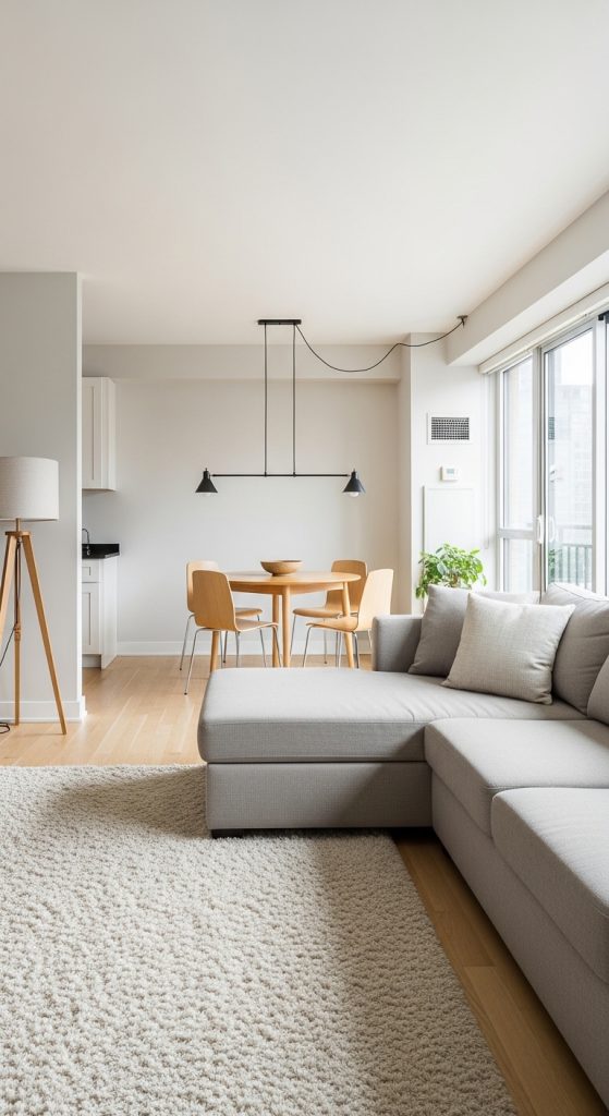 Use area rugs to separate the living room from the dining space. For example, place a large rug under the sofa and coffee table to visually mark the living area. Choose materials that match across spaces, such as similar wood tones for furniture or consistent wall colors.
