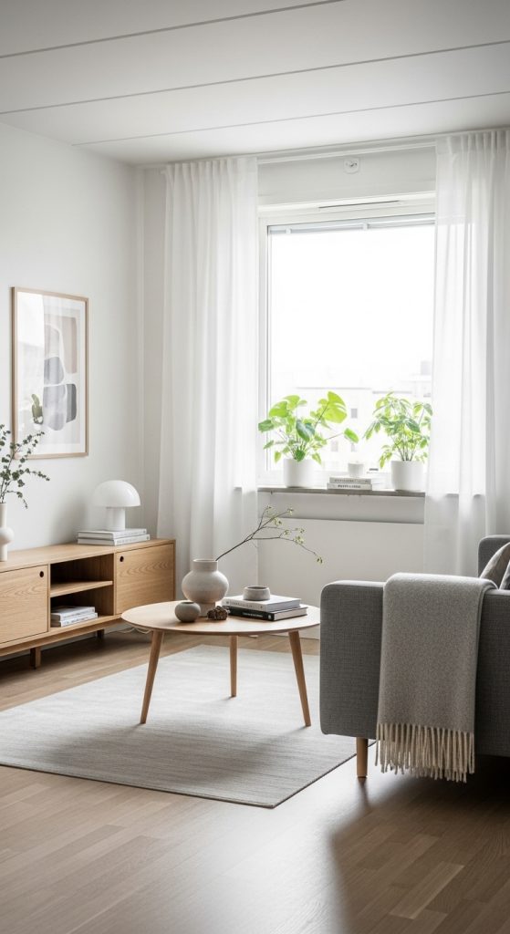 Keep decoration minimal but meaningful. One large artwork or a simple wall clock can become a focal point. Scandinavian design values functionality, so every item should have a purpose. The result is a bright, calm, and comfortable condo living room that feels modern and welcoming.