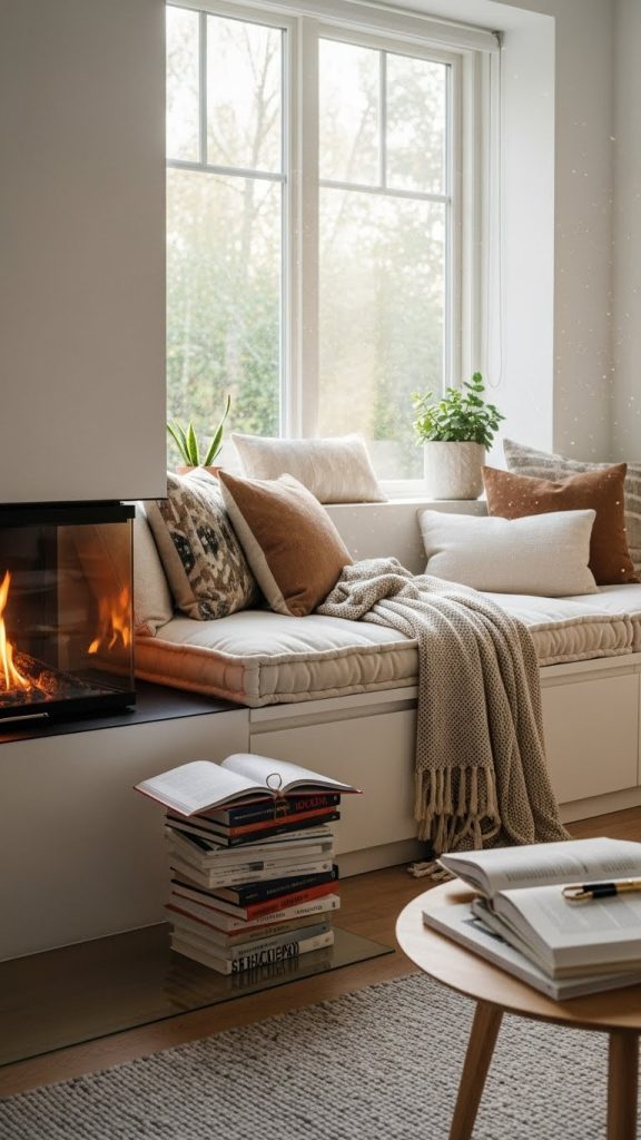 Combining a fireplace with a window seat creates a bright and comforting reading spot. This idea works best when the fireplace is located near a window or along the same wall. The natural light during the day reduces the need for artificial lighting.