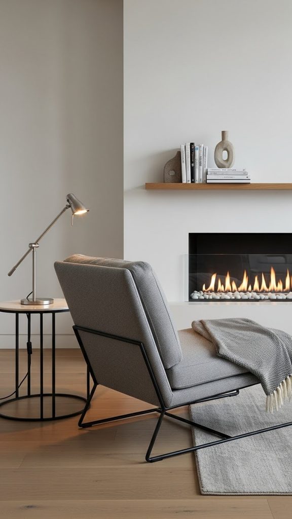Place the chair at a safe distance from the fireplace to avoid heat discomfort. Add a small wooden or metal side table to hold books, reading glasses, and a warm drink. For lighting, use a floor lamp with a warm bulb placed slightly behind or beside the chair to reduce eye strain.