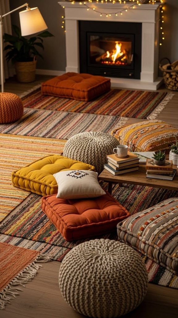 Floor seating is budget friendly, easy to rearrange, and perfect for people who enjoy flexible living spaces. It also adds a warm and inviting feel to the room without heavy furniture.