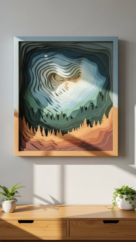 Layered landscape art made from cardboard creates a stunning dimensional effect that resembles paper cut scenery. Prepare different shades of cardboard or use paint to create color variations. Sketch simple mountain ranges, hills, or trees on separate pieces of cardboard and cut them out carefully. Layer the pieces by placing the background shapes at the bottom and stacking the foreground pieces above using glue or small cardboard spacers. This technique creates depth similar to shadow box artwork. You can frame the piece using additional cardboard strips to give it a finished appearance. This decor is ideal for living rooms, reading corners, and cozy spaces because the layered effect generates a calm and artistic atmosphere. Cardboard is perfect for this project because it holds shape well and provides subtle thickness for layering. Painting the layers in soft gradients enhances the visual appeal even further. With a simple design and thoughtful assembly, you can achieve a high quality artwork that looks professionally crafted. This project encourages creativity because you can adapt the landscape to match any theme, whether minimalist, vibrant, or nature inspired.