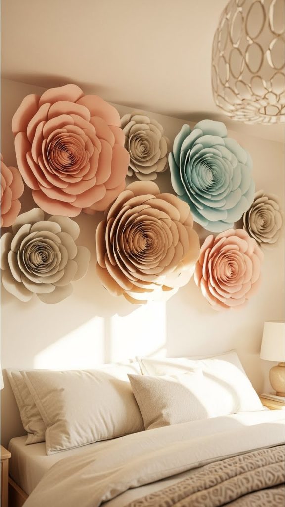 For those who prefer soft and elegant designs, layered cardboard flowers offer a charming wall decor option. Begin by preparing several sheets of cardboard, a pencil, cutting tool, glue, and paint. Draw petal shapes in different sizes to create depth when layered. Cut multiple pieces of each petal shape and gently curve the edges by rolling them over a pencil. This simple step adds realistic dimension and prevents the flowers from appearing flat. Assemble the flowers by gluing larger petals at the bottom and gradually adding smaller ones toward the center. You can create a single large statement flower or several medium sized ones arranged into a bouquet style composition. Paint the flowers in pastel tones for a soft aesthetic or bold colors for a more dramatic effect. This type of decor works wonderfully in bedrooms, nurseries, or reading corners where a touch of softness enhances the ambiance. Cardboard is an excellent material for this project because it holds shape well while remaining easy to manipulate into curved forms. The finished flowers give the appearance of handmade paper sculptures often sold in boutique home decor stores. With patience and attention to layering, this project produces elegant results without requiring expensive supplies.