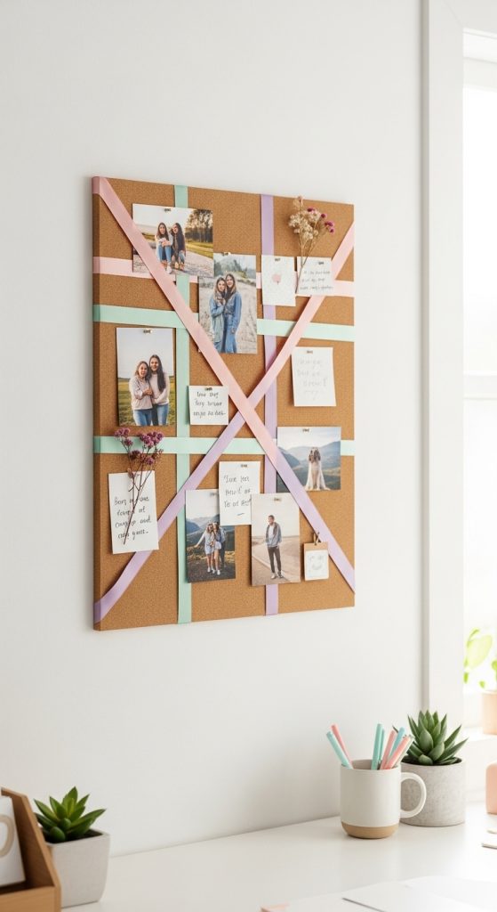 A pastel memory board helps you display photos, notes, and inspirational messages in a visually appealing way. To make one, gather a cork board or foam board, pastel fabric or paper, adhesive spray or glue, ribbons, push pins, and scissors. Begin by cutting your fabric or paper so it overlaps the edges of the board. Secure it tightly with adhesive, smoothing out any wrinkles. Choose complementary pastel ribbons and arrange them across the board in a crisscross or horizontal pattern. Secure the ribbon ends at the back using glue or pins. The ribbons will serve as holders for photos and small papers. For additional decoration, use pastel painted push pins to attach items directly to the board. Memory boards can also include small embellishments such as lace strips, buttons, or pre cut labels in soft tones. Hang the completed piece on a wall or stand it on a desk where you can easily update the displayed content. This craft allows for sentimental personalization and works well for bedrooms, study areas, or offices. Pastel colors provide a clean and calming aesthetic that encourages creativity and focus.