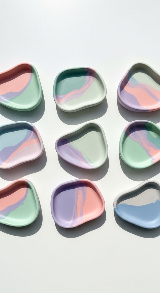 Pastel clay trinket dishes provide a functional and beautiful way to store jewelry, keys, and small accessories. For this project you will need air dry clay or polymer clay, pastel colored pigments or soft tone acrylic paint, rolling tools, a bowl or dish to use as a mold, sandpaper, and a matte sealant. Begin by kneading the clay to warm it and make it easier to shape. Roll it out evenly on a flat surface and press it gently into or over a bowl to create the curved dish shape. Smooth the edges with your fingers or a sculpting tool before letting it dry. Air dry clay will take several hours to harden, and polymer clay will need baking according to the package instructions. Once the dish is fully dry, sand the edges to achieve a polished finish. Add pastel colors either by mixing pigment into the clay beforehand or by painting the dish once it is hardened. Designs could include simple blocks of color, faint marbling, or delicate patterns. Seal the completed piece to protect it from scratches. This craft works well as a personalized gift, and the pastel palette gives each dish a soft and elegant look suitable for bedside tables, dressers, and entryway consoles.