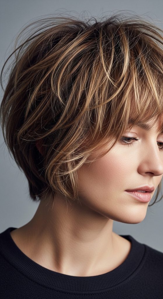 The shaggy pixie cut is inspired by classic shag hairstyles but adapted for short hair. It features uneven layers and soft texture that create a relaxed, effortless look.