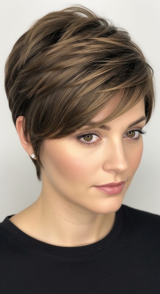 The layered pixie with a side part is both elegant and edgy. The side part creates volume while the layers add texture and movement.