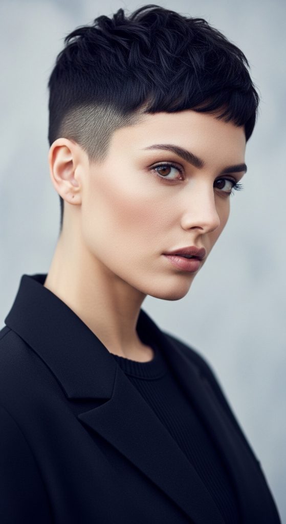 The buzzed pixie cut is one of the boldest short hairstyles. It involves extremely short sides and back with slightly longer hair on top.