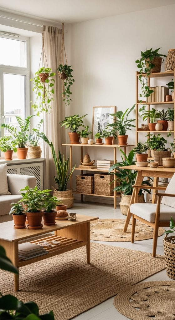 Start with low-maintenance plants like pothos, snake plants, or peace lilies that thrive in indoor environments. Choose decorative pots in neutral or terracotta tones for a natural look. Complement greenery with other natural textures like wicker baskets, bamboo furniture, or linen fabrics. Ensure plants receive adequate light, or use artificial plants if your apartment has limited windows.