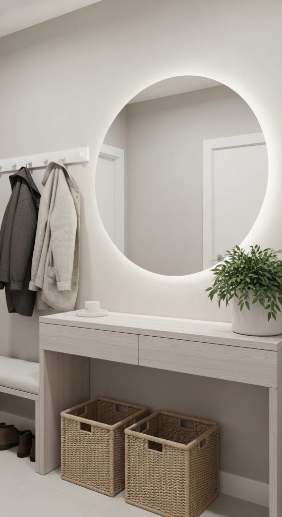 If you lack a built-in foyer, create one with a narrow console table, wall hooks, and a small rug. Add a mirror to open up the space and check your look before heading out. Incorporate baskets or storage bins beneath the table for shoes or seasonal items.