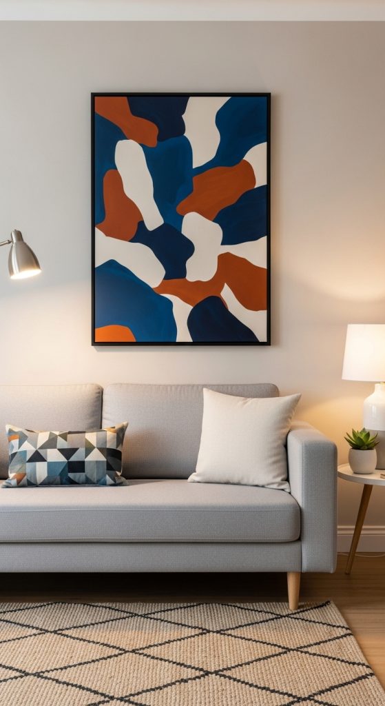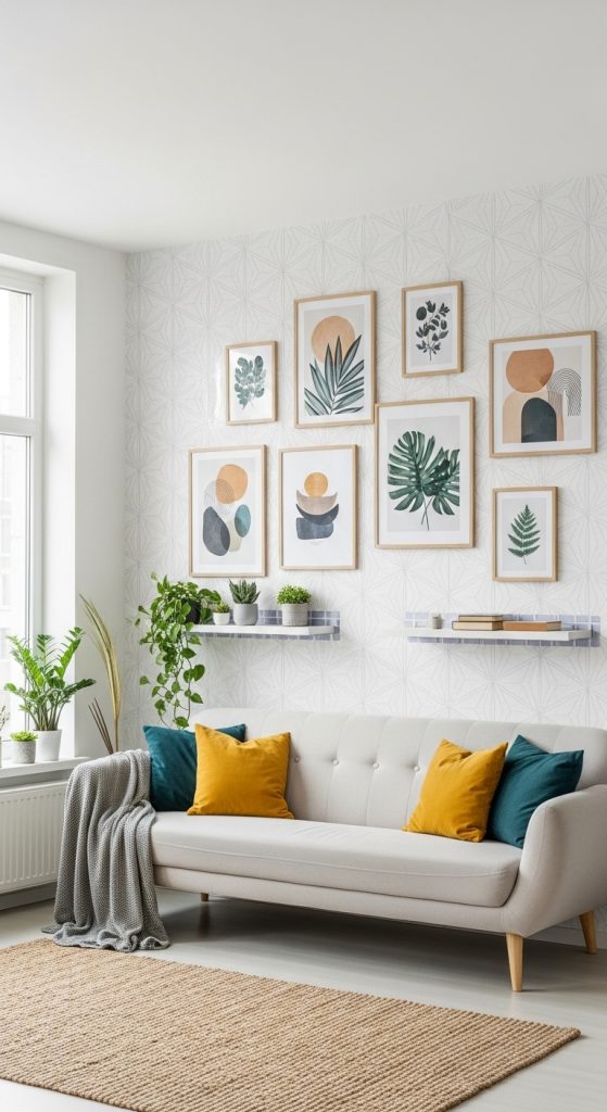 Plan a gallery wall or choose one large framed piece to anchor the room. Use lightweight frames, washi tape, or adhesive hooks to avoid wall damage. Mix different art sizes and textures for visual interest. Add a mirror or wall clock to break up flat surfaces.