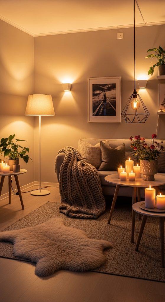 Lighting is one of the most powerful tools in interior design. It not only brightens a room but also influences mood and visual comfort. Instead of relying on a single overhead light, layer multiple light sources for a balanced and cozy atmosphere.