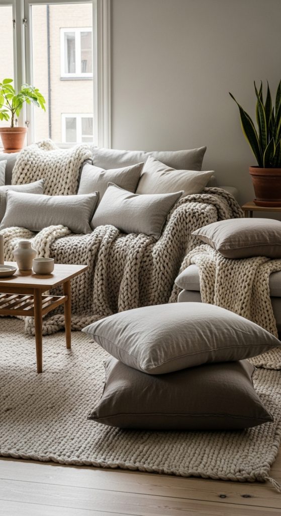 Mix materials like cotton, wool, velvet, and linen to create tactile contrast. Use area rugs to define zones in open-plan layouts. Opt for curtains that complement wall tones while offering privacy. Choose neutral or pastel colors for a calm aesthetic, and layer blankets at the foot of your bed or across the sofa.