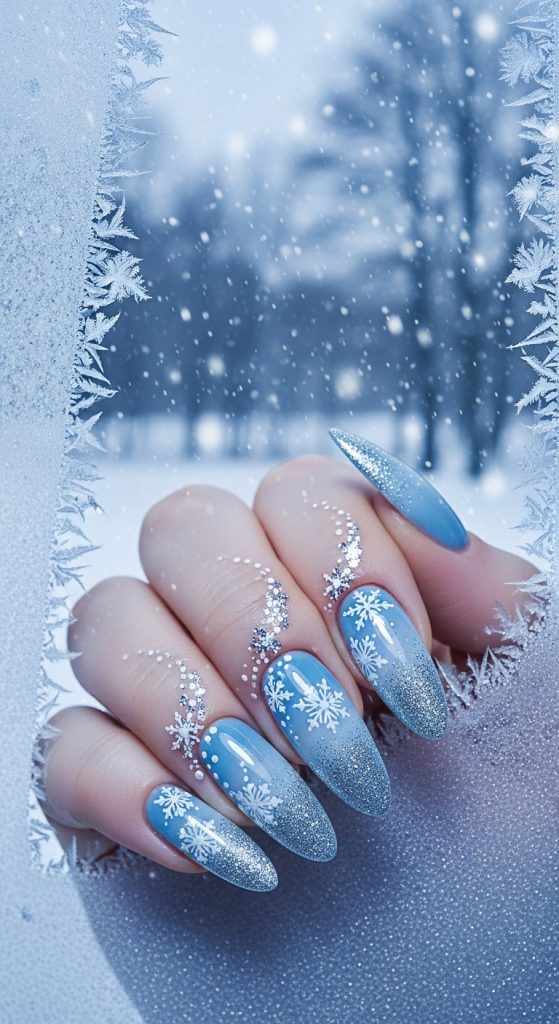 If you prefer a cooler color palette, frosted blue nails capture the icy essence of winter perfectly. Begin with a pastel or icy blue base color and let it dry completely. Apply a layer of silver glitter polish or fine shimmer powder to the tips or over the entire nail for a frosted effect. You can also create snowflake or icicle designs using white polish or stamping plates. For extra dimension, add small rhinestones or crystal studs that mimic frozen dew drops. Finish with a high-gloss topcoat to lock in the shine and sparkle. Frosted blue nails are elegant and sophisticated, ideal for those who want a modern twist on traditional Christmas colors. They complement silver accessories beautifully and bring a sense of calm winter beauty to your holiday look.