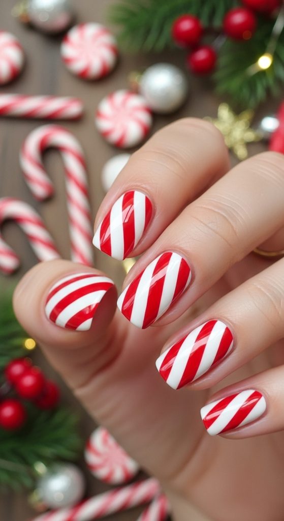 Candy cane striped nails are playful, bright, and a perfect representation of Christmas sweetness. Start with a white nail polish base and allow it to dry thoroughly. Use thin striping tape to create diagonal lines across your nails. Paint over the white base with a bright red polish, and once it dries, carefully remove the tape to reveal the candy cane stripes. For an added twist, use glittery red polish or add a fine silver line between each stripe for more definition. Finish with a clear topcoat to give your nails a glossy shine and long-lasting protection. This design works wonderfully for both short and long nails and can be done on all nails or just a few accent ones. Candy cane stripes bring a cheerful, fun element to your Christmas look and are sure to grab attention wherever you go.
