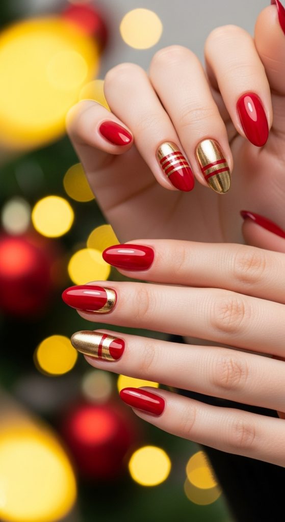Classic red and gold nails are timeless for Christmas. They capture the warmth and glamour of the season perfectly. To create this look, start by cleaning and filing your nails into your preferred shape, such as almond or square. Apply a clear base coat to protect your nails from staining. Once dry, apply two coats of a rich red polish. Allow each coat to dry completely. Next, use gold nail polish or metallic foil for accent nails or to create delicate designs such as stripes or half-moons. A thin nail brush can help you achieve precise lines. Seal the design with a glossy topcoat to enhance shine and durability. This combination of red and gold gives an elegant and traditional finish that pairs beautifully with festive outfits. These nails suit both short and long lengths, making them versatile for any occasion during the holiday season.