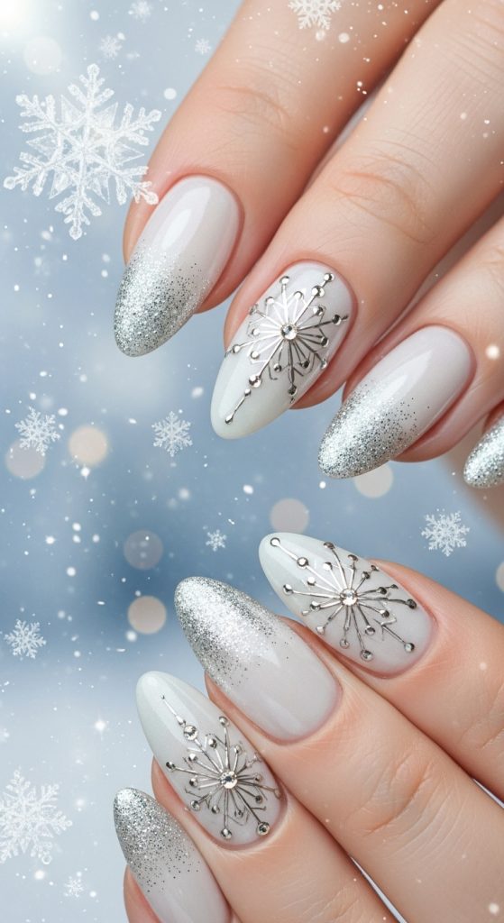 White glitter nails with snowflake accents are delicate and enchanting. Begin by prepping your nails and applying a strong base coat. Choose a pearly white or translucent white polish as the base color. After applying two even coats, let them dry before adding fine silver or white glitter polish to create a frosty look. For a more festive feel, use a fine brush or stamping tool to draw snowflakes on one or two accent nails using silver polish or white acrylic paint. Seal everything with a glossy topcoat to prevent chipping and enhance the shimmer. The result is a wintry, frosted look reminiscent of snow-covered landscapes. These nails look stunning under light, giving your hands a magical sparkle perfect for Christmas gatherings or winter parties. They pair beautifully with cozy sweaters and silver jewelry, offering a soft yet elegant holiday aesthetic.