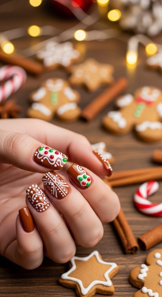 Gingerbread nails are adorable and festive, perfect for adding a sweet touch to your holiday look. Start by painting your nails with a warm caramel or light brown polish to resemble gingerbread. Once dry, use white nail polish or acrylic paint to draw icing-inspired details, such as squiggly lines or dots around the edges. Add red and green dots to represent candy decorations. If desired, draw small gingerbread men on accent nails using a fine brush. Seal the design with a glossy topcoat to achieve that cookie-like shine. Gingerbread nails bring a cozy and cheerful vibe, perfect for family gatherings and baking days during the Christmas season. This creative design adds personality to your manicure and is sure to make your nails a delightful conversation starter.