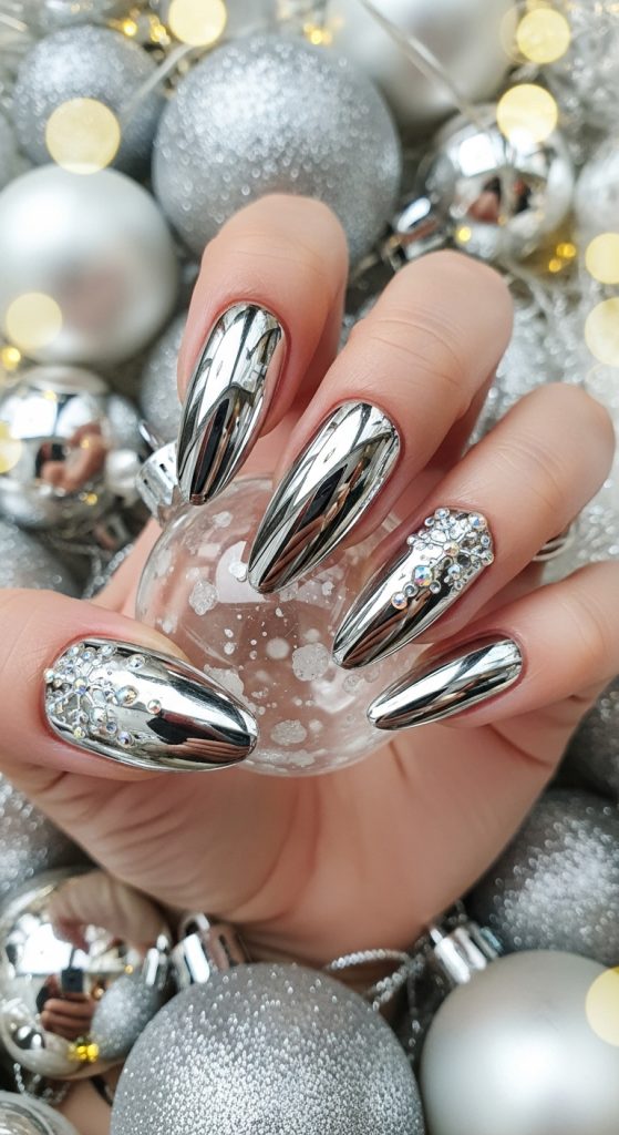 Silver chrome nails bring a futuristic and glamorous edge to your Christmas style. Begin by applying a base coat followed by a layer of black or dark gray polish, which helps the chrome effect stand out. Once dry, gently rub chrome powder onto each nail using an applicator sponge until the metallic sheen appears. Seal it with a non-smudge topcoat to preserve the shine. To add a holiday touch, decorate with small rhinestones, snowflake stickers, or white accents. These nails reflect light beautifully, creating a mirror-like surface that draws attention. Silver chrome nails look particularly striking with metallic jewelry and festive outfits. They suit any nail length and instantly elevate your look, making them ideal for Christmas parties or New Year celebrations.