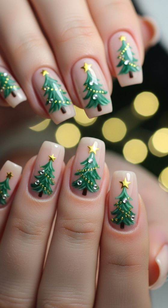 Green and gold nails inspired by Christmas trees bring the beauty of festive greenery right to your fingertips. Begin with a nude or light beige polish as your base to make the green pop. Once dry, use green nail polish or gel to paint small Christmas tree shapes on one or two accent nails. You can use a fine brush or nail stencil for precision. Add gold dots or tiny rhinestones as ornaments to decorate your miniature trees. For the finishing touch, place a small gold star sticker or a drop of gold polish at the top of each tree. Seal your design with a topcoat to ensure durability and shine. The combination of green and gold evokes the beauty of a decorated Christmas tree, making this a stylish and creative choice for the holidays.