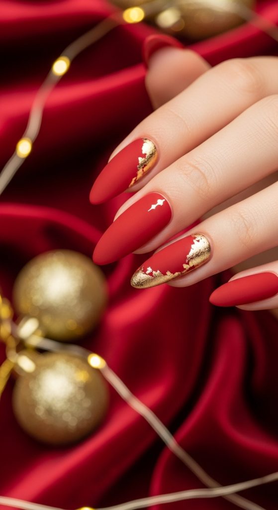 Matte red nails are simple yet stunning, giving off an elegant velvet-like appearance. To create this sophisticated look, start with a smooth base coat and apply two coats of deep red polish. Once dry, use a matte topcoat to remove the shine and create a soft texture. For a festive twist, add gold foil flakes or small rhinestones on one or two nails. You can also add a glossy red stripe across the matte surface for contrast. The red velvet finish gives your nails a luxurious, modern feel that pairs beautifully with evening wear. These nails are timeless and classy, perfect for Christmas dinners or formal events. The simplicity of matte red nails allows them to stand out without being overly flashy, making them a top choice for those who appreciate understated elegance.