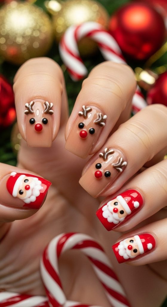 Reindeer and Santa accent nails are whimsical and full of Christmas cheer. To start, paint most of your nails with a festive red or green polish. Choose one or two accent nails for the designs. For a reindeer nail, use a tan or brown base, then paint small eyes, a red nose, and antlers using fine nail brushes. For Santa, use a red base and add white polish to form the hat trim and beard. You can also add tiny rhinestones for Santa’s buttons or Rudolph’s nose for a 3D effect. Once all the details are complete, apply a clear topcoat for shine and protection. These nails are perfect for holiday parties and add a fun storytelling element to your manicure. They work well on medium or long nails, allowing more space for detailed artwork.