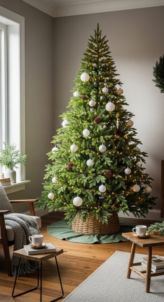A lush green Christmas tree serves as the heart of any festive living room. For this decor idea, focus on creating an evergreen masterpiece that radiates natural beauty. Choose a real or high-quality artificial fir tree in deep green hues. For preparation, gather classic ornaments in shades of white, silver, or muted gold to complement the green base. Add pinecones, small wooden figurines, and white ribbon to maintain a balanced look. Place the tree in a woven basket or wooden crate for a rustic touch.