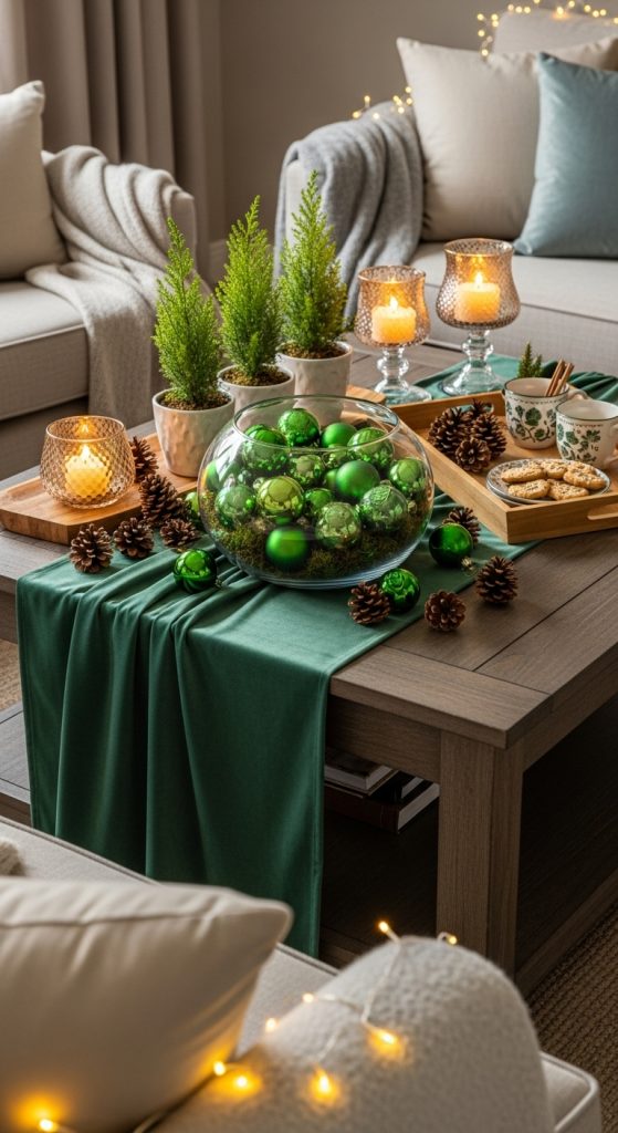 Your coffee table can become a stunning focal point during Christmas with the right green-themed decor. Preparation begins with selecting a simple base such as a wooden or glass tabletop. Use a green runner or small tablecloth as the foundation for your display.