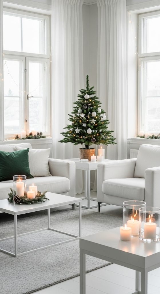 Use a small green tree or tabletop greenery instead of a large centerpiece. Decorate with white ornaments, frosted pinecones, and minimal ribbons. Introduce green through pillows, throws, and subtle garlands along mantels or windows. A white rug can complement the natural tones and maintain a fresh ambiance.