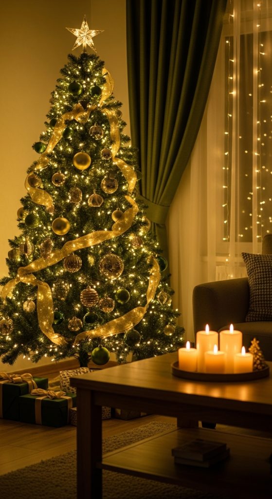 Lighting plays a vital role in emphasizing green Christmas decor. This idea focuses on creating visual harmony through thoughtful ornament placement and lighting balance. Preparation involves selecting a consistent color palette—green, gold, and white work beautifully together.