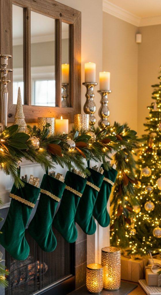 Add layered textures using green velvet stockings, mini wreaths, and candles in glass holders. To elevate the design, include golden or silver accents for subtle contrast. Hanging pinecones or small ornaments from the garland adds festive detail.