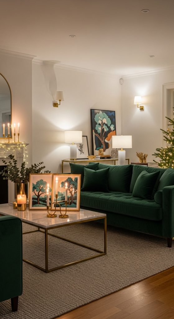 Velvet embodies elegance, and using green velvet accents instantly gives your living room a sophisticated Christmas atmosphere. Begin by selecting velvet throw pillows, an accent chair, or even a green velvet ottoman to add texture and richness. Deep emerald or forest green shades are ideal for creating a timeless holiday look.