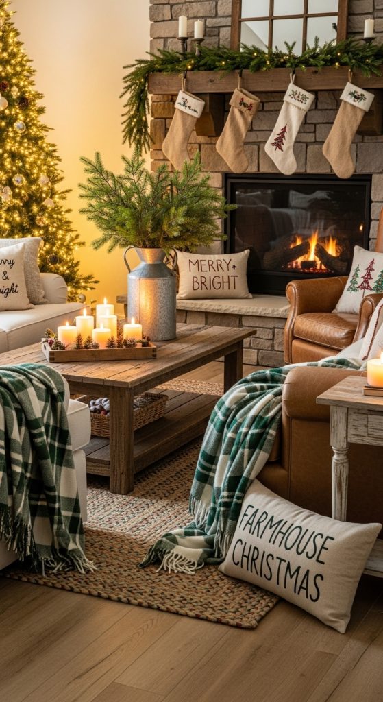 A green plaid blanket over the sofa, pine-scented candles, and reclaimed wood furniture tie the look together. For greenery, use natural pine branches or faux garlands arranged in vases or along shelves. Incorporate soft, warm lighting using lanterns or Edison bulbs to maintain a rustic ambiance.