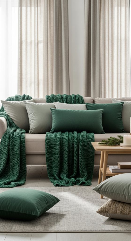 Curtains in soft green tones or neutral linen will complement the overall color palette. Balance the richness of green with white or beige accessories to prevent overwhelming the space. The tactile comfort of layered textiles combined with natural green hues creates an inviting holiday retreat perfect for relaxing or entertaining.