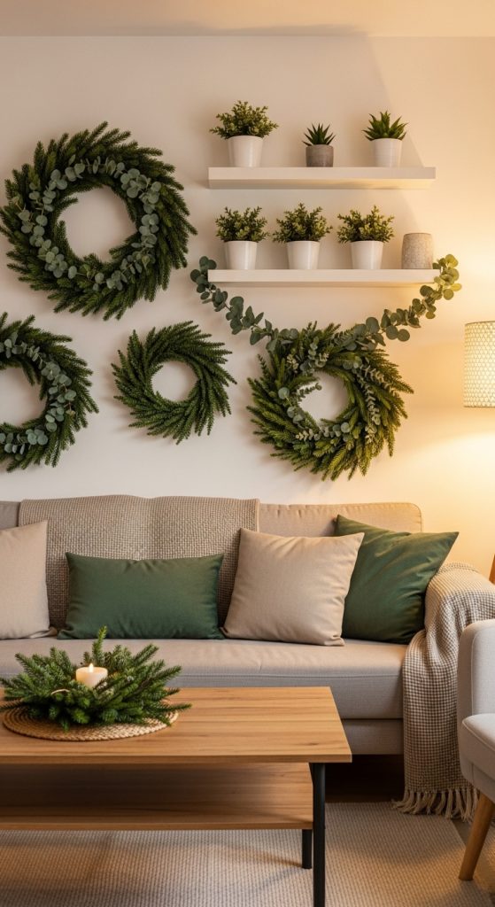 Green wall decor can transform your living room into a botanical Christmas wonderland. For this theme, use greenery as the foundation of your wall design. Start by gathering wreaths made of pine, eucalyptus, or olive branches. You can hang multiple wreaths in varying sizes for a layered look.